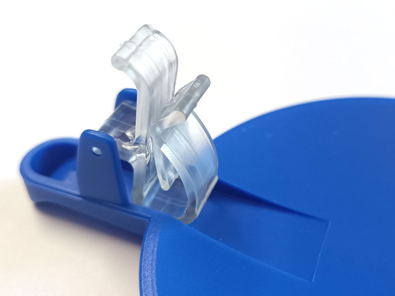 Das Bild zeigt die Unterseite eines Klappdeckels mit dem Kunststoff-Clip, der am Gefäß befestigt wird.