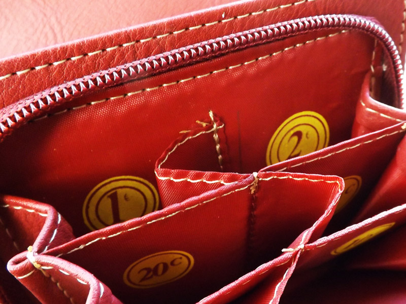 Praktische Euro Geldbörse mit 8 separaten Kleingeld-Fächern, die mit einem Reißverschluss geschlossen werden. Großes Fach für Banknoten und diverse Kartenfächer (eins davon mit Klarsichthülle). Druckknopfverschluss zum Schließen des gesamten Portemonnaies. Material: Lederimitat, Farbe: rot, Maße: ca. 12,5 x 9,5 x 3,5 cm.