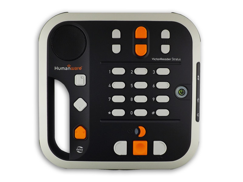 Weiterhin verfügt der Victor Reader Stratus 12 M über einen automatischen CD-Einzug, Steckplätze für USB-Sticks und SD-Karten sowie einen eingebauten Lautsprecher. Der eingebaute Block-Akku kann, falls nötig, ohne fremde Hilfe gewechselt werden. Ein Anschluss für Kopfhörer, externen Lautsprecher und das mitgelieferte Netzteil sind vorhanden. Ein Tragegriff erleichtert das Tragen des Gerätes. Abmessung mit Griff 22 x 22 x 5 cm, Gewicht 950 g.